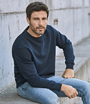70% ringspun cotton/30% polyester. Three thread fabric for a smooth surface. Brushed back fleece. Double dyed. Drop shoulder style. Ribbed collar, cuffs and hem with elastane. Twin needle stitching. 60°C wash.